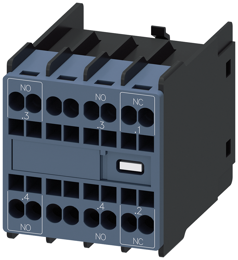 Auxiliary switch on the front, 2 NO + 1 NC Current path 1 NO, 1 NO, 1 NC, 1 NC for 3RH and 3RT spring-type terminal .3/.4, --/-- , .3/.4, .1/.2 1 NO conventional 1 NO + 1 NC