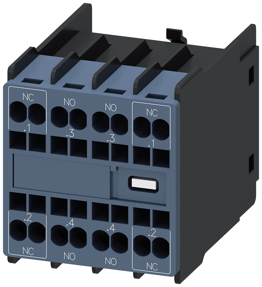 Auxiliary switch on the front, 2 NO + 2 NC Current path 1 NC, 1 NO, 1 NO, 1 NC for 3RH and 3RT spring-type terminal .1/.2, .3/.4, .3/.4, .1/.2 2 NO conventional 2 NC