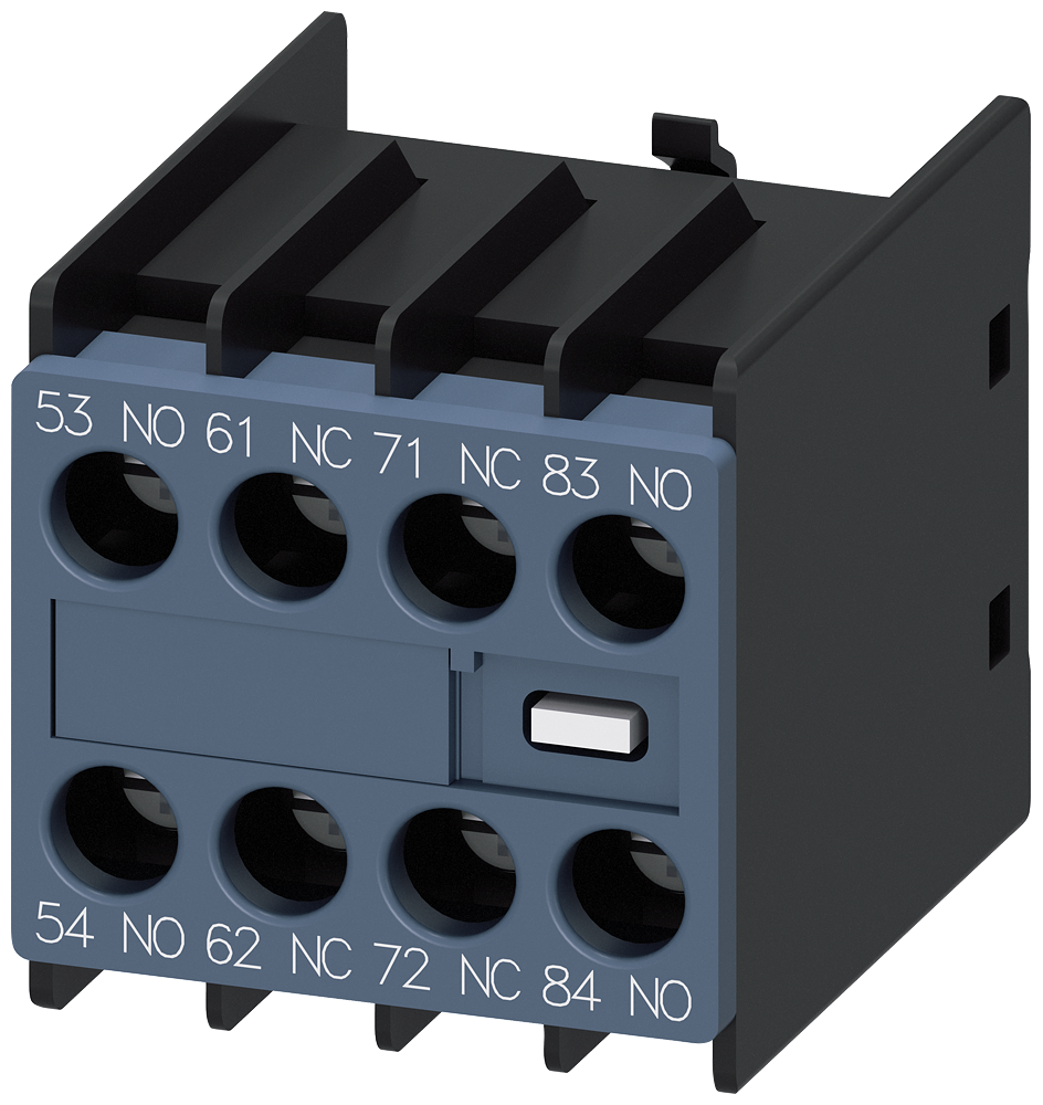 Auxiliary switch on the front, 2 NO + 2 NC Current path 1 NO, 1 NC, 1 NC, 1 NO for 3RH and 3RT screw terminal 53/54, 61/62, 71/72, 83/84