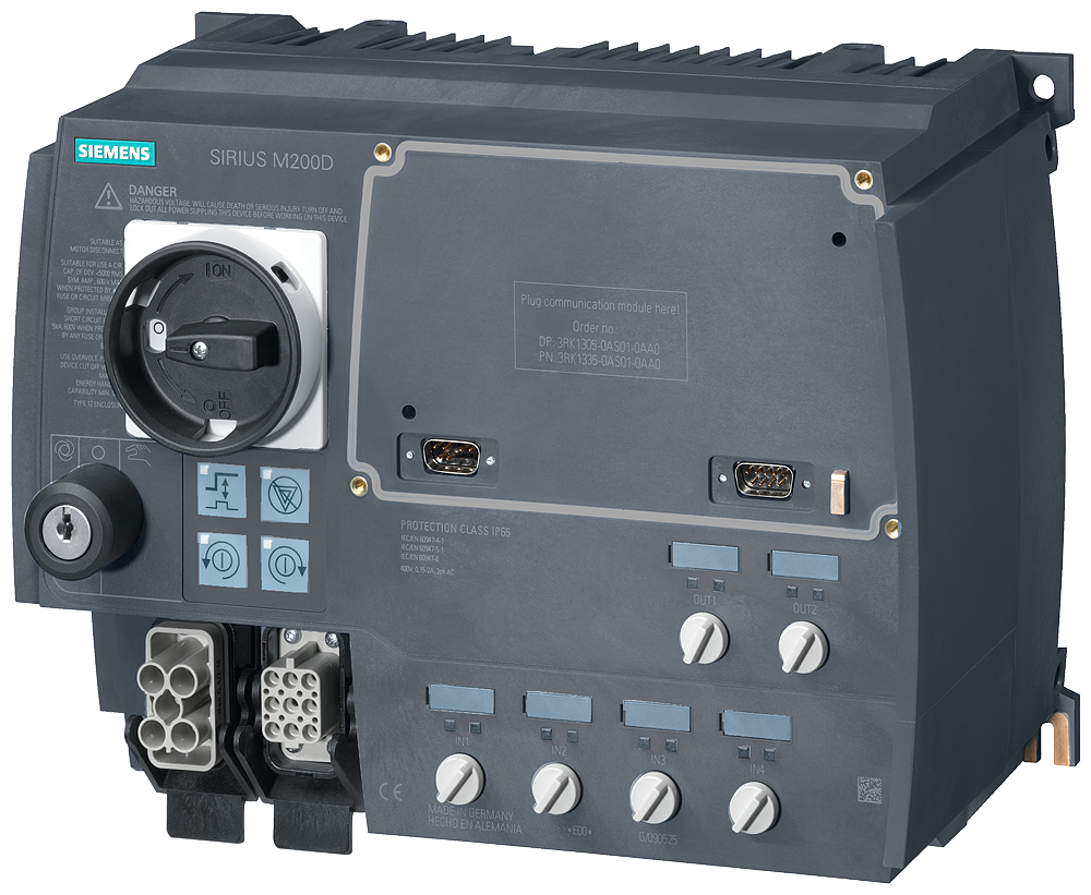 ПУСКАТЕЛЬ ЭЛЕКТРОДВИГАТЕЛЯ SIRIUS M200D TECHНОLOGIEMODUL DIRECT ON-LINE STARTER ELECTRONIC SWITCHING 3 400V, AC/0,9КВТ, 0,15A...2,00A, ELECTRONIC OVERLOAD PROTECTION, ТЕРМИСТОРНАЯ ЗАЩИТА: THERMOCLICK / PTC БЕЗ ТОРМОЗНОГО КОНТАКТА, 4DI / 2DO HAN Q4/2 - HAN Q8/0 WITH OPERATOR TERMINAL И KEY-OPERATED SWITCH USING A COMMUNICATION МОДУЛЬ 3RK1305* USABLE WITH PROFIBUS OR PROFINET