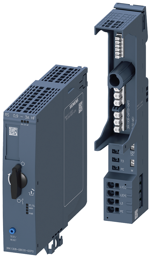 Стартовый комплект ET 200SP MS включая пускатель электродвигателя 3RK1308 0,9–3 A, Реверсивный пускатель, Базовое устройство с питанием 24 В и 500 В, ЭМС-промежуточный модуль (пустой модуль 15 мм)