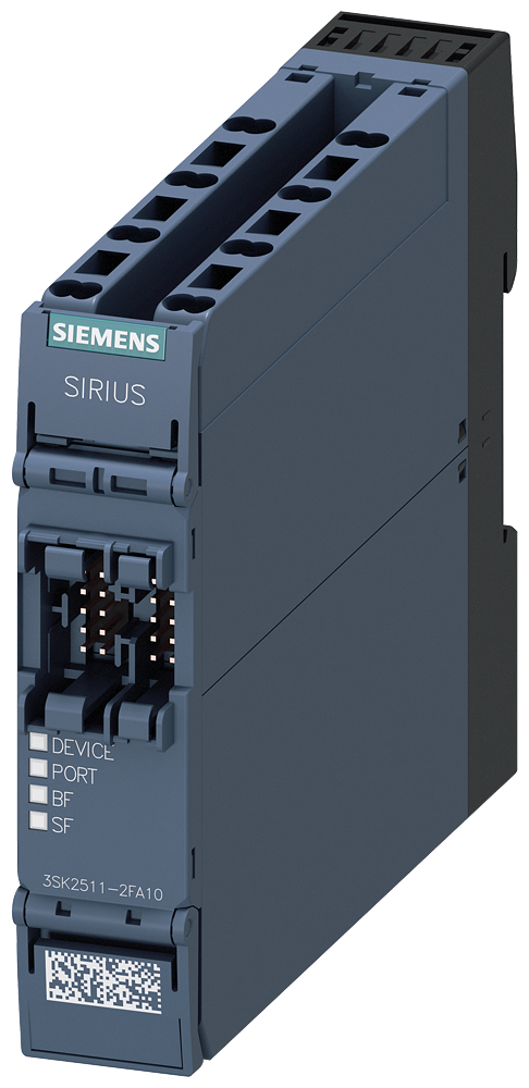 SIRIUS, Интерфейсный модуль Интерфейс PROFINET для предохранительного реле 3SK2 и 3RK3 Интерфейс PROFINET-IO 100 Мбит/с, RJ45 Установочная ширина 22,5 мм Пружинная клемма параметрируется с помощью Safety ES без соединительного кабеля