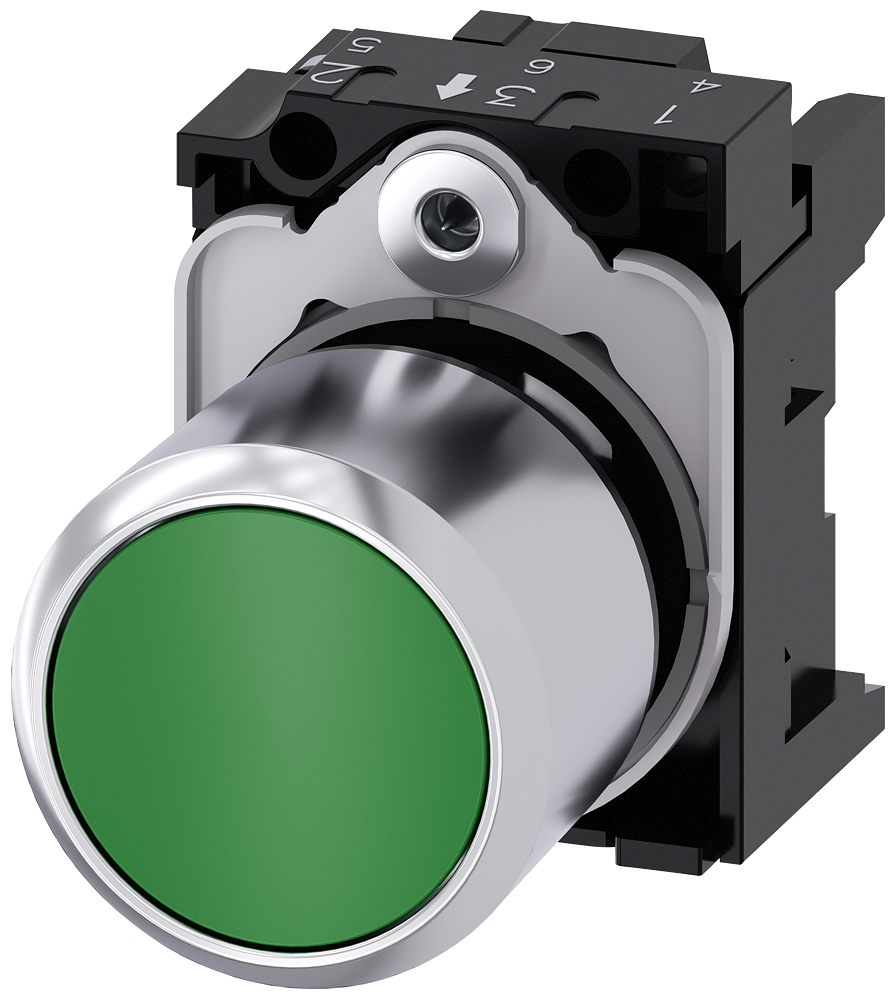 АКТУАТОР КНОПКИ С ВЫСОКИМ ФРОНТАЛЬНЫМ КОЛЬЦОМ (12MM), 22MM, КРУГЛ., МЕТАЛЛ, КНОПКА ЗЕЛЁНАЯ ПЛОСКАЯ, БЕЗ ФИКСАЦИИ, С ДЕРЖАТЕЛЕМ