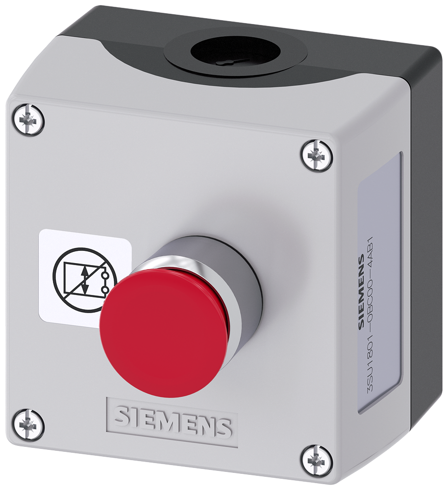 Enclosure for command devices 22 mm, round, Enclosure material plastic, enclosure top part gray, 1 control point, A = push-pull actuator red, metal, 30 mm, 1 NC, spring-type terminal, floor mounting, support terminal, customized label, 1xM20 each on top and bottom Offer 47081