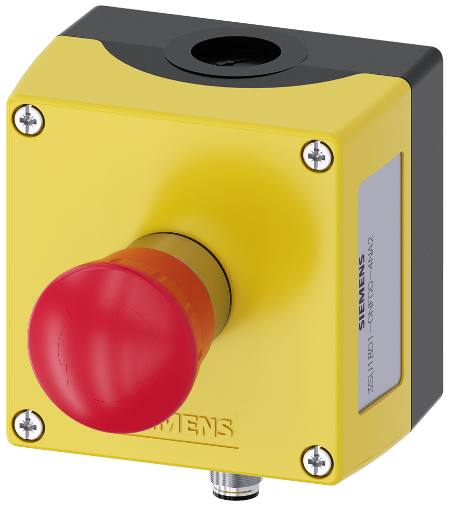 Корпус для командных устройств 22 мм, кругл., материал корпуса: пластмасса, верхняя часть корпуса, цвет: желтый, 1 командный пункт, пластмасса, A = грибковый аварийный выключатель, цвет: красный, 40 мм, поворотная деблокировка, 1 НЗ, 1 НЗ, подключение на пружинных клеммах: монтаж на полу, смонтировано, без шильдика, внизу штекер M12 4-полюсный,