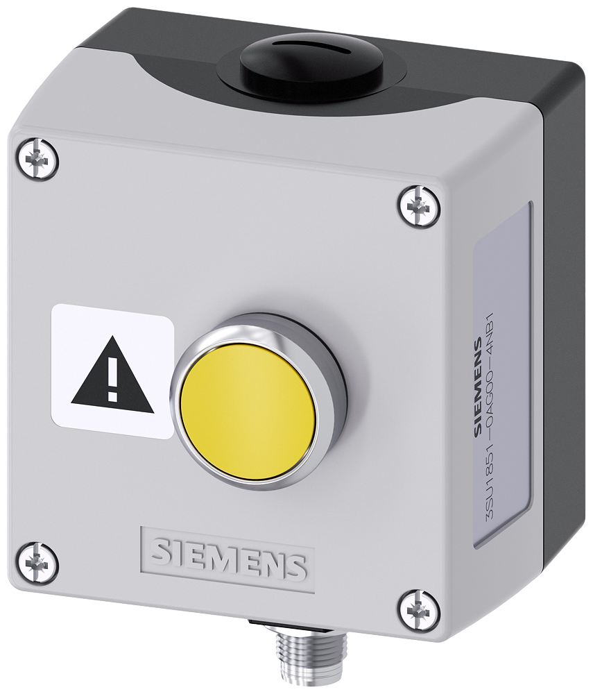Корпус командных устройств, 22 мм, кругл., материал корпуса: металл, верхняя часть корпуса, цвет: серый, 1 командный пункт, металл, A = кнопочный выключатель, цвет: желтый, 1 НО, подключение на пружинных клеммах: монтаж на полу, шильдик серебристый, шрифт: черный, с графическим символом: «Ошибка», штекер M12 (5-полюсный) снизу, изолированные резервные жилы шильдик вклеен