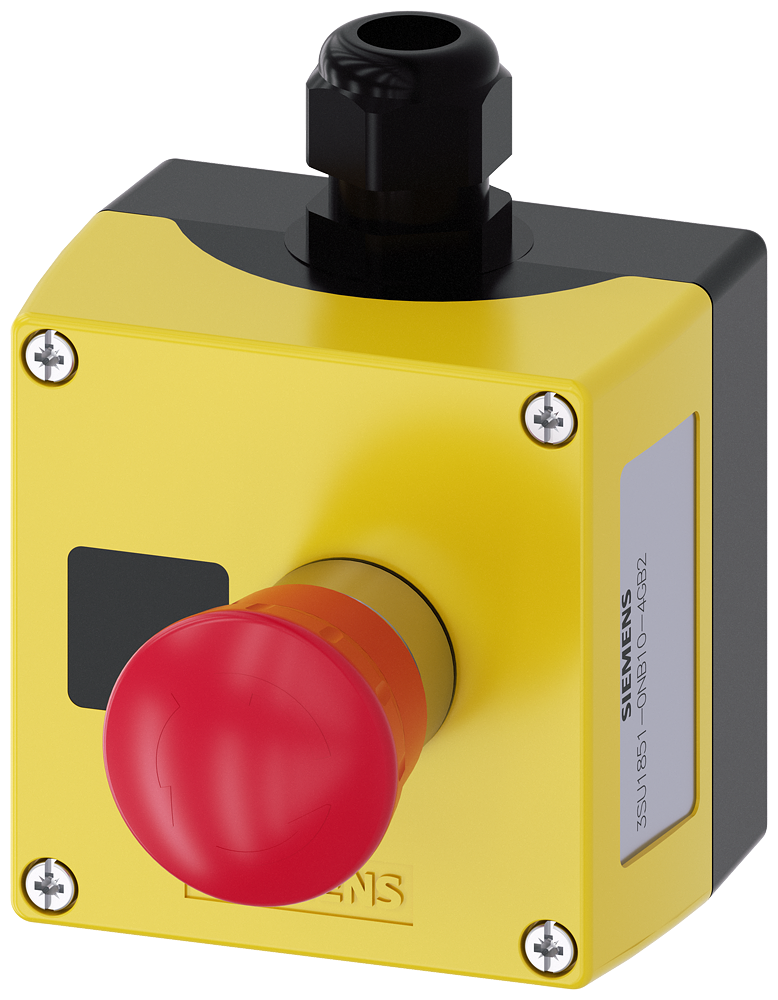 AS-Interface enclosure for command devices 22 mm, round, Enclosure material metal, Enclosure top part yellow, 1 control point metal, Recess for label, A=EMERGENCY STOP mushroom pushbutton red, 40 mm, rotate-to-unlatch, 1 NC, 1 NC, spring-type terminal, floor mounting, AS-i shaped cable Direct entry top/right