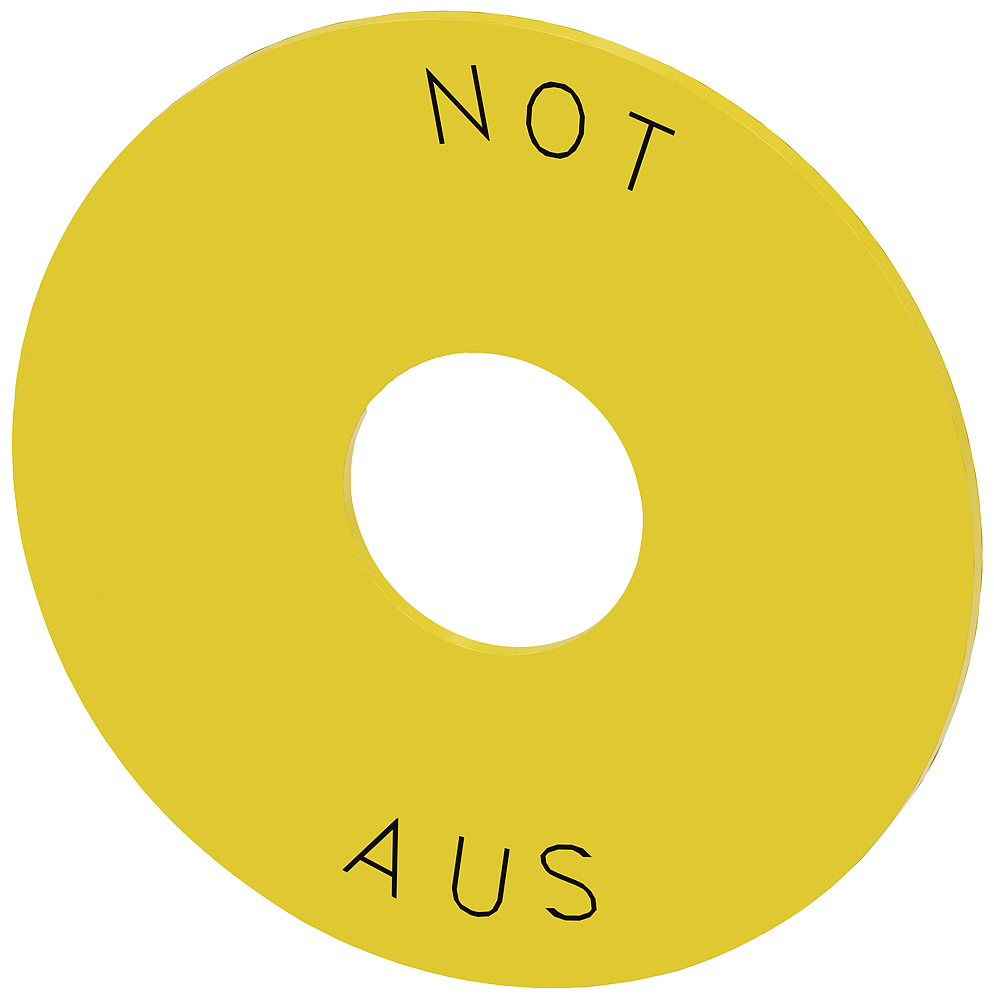ПОДЛОЖКА ДЛЯ КНОПОК АВАРИЙНОГО ОСТАНОВА, ЖЕЛТАЯ, С МАРКИРОВКОЙ: NOT-AUS, НАРУЖНЫЙ ДИАМЕТР 75MM, ДИАМЕТР ОТВЕРСТИЯ 22.5MM, ТОЛЩИНА 2MM