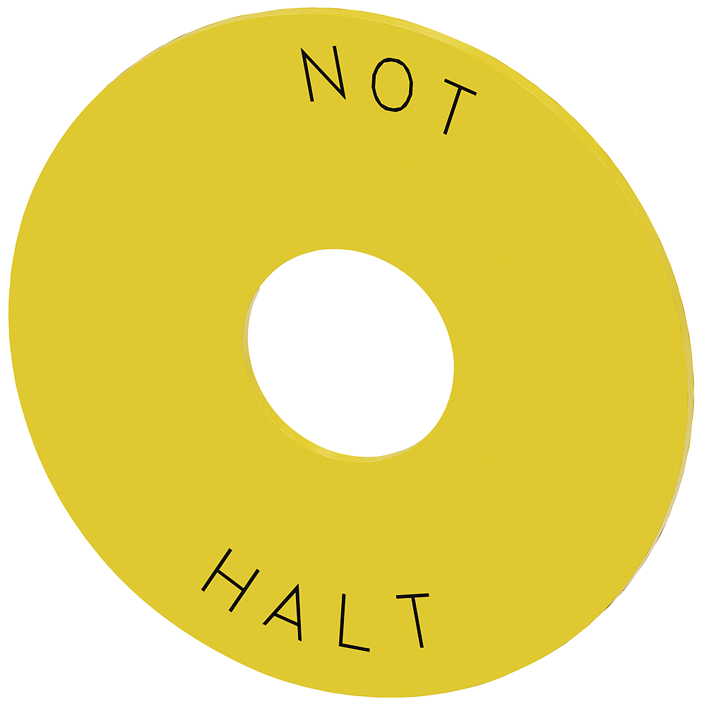 ПОДЛОЖКА ДЛЯ КНОПОК АВАРИЙНОГО ОСТАНОВА, ЖЕЛТАЯ, С МАРКИРОВКОЙ: NOT-HALT, НАРУЖНЫЙ ДИАМЕТР 75MM, ДИАМЕТР ОТВЕРСТИЯ 22.5MM, ТОЛЩИНА 2MM