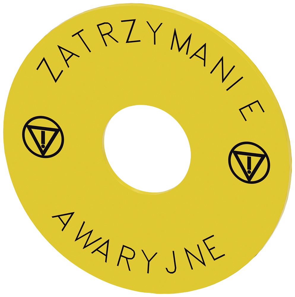 ПОДЛОЖКА ДЛЯ КНОПОК АВАРИЙНОГО ОСТАНОВА, ЖЕЛТАЯ, С МАРКИРОВКОЙ (POLISH), ZATRZYMANIE, SYMBOL 5638, AWARYJNE, SYMBOL 5638, НАРУЖНЫЙ ДИАМЕТР 75MM, ДИАМЕТР ОТВЕРСТИЯ 22.5MM, ТОЛЩИНА 2MM
