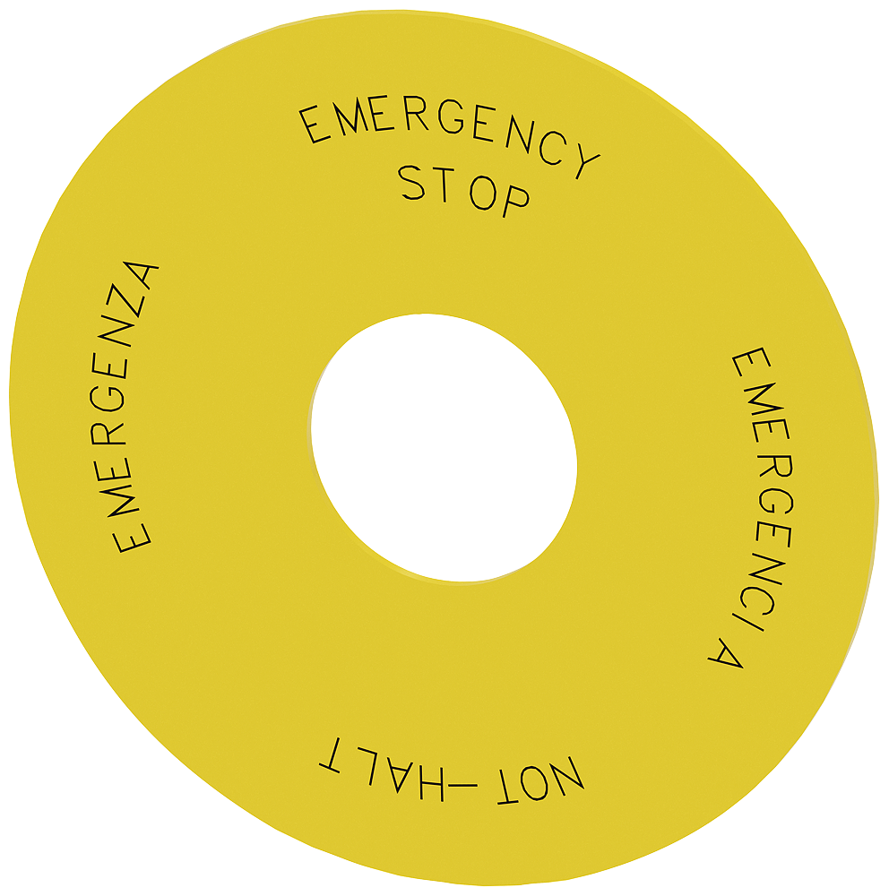 ПОДЛОЖКА ДЛЯ КНОПОК АВАРИЙНОГО ОСТАНОВА, ЖЕЛТАЯ, САМОКЛЕЯЩАЯСЯ, НАРУЖНЫЙ ДИАМЕТР 75MM, ДИАМЕТР ОТВЕРСТИЯ 23MM, С МАРКИРОВКОЙ: EMERGENCY STOP, 4 ЯЗЫКА: DE,EN, IT,SP