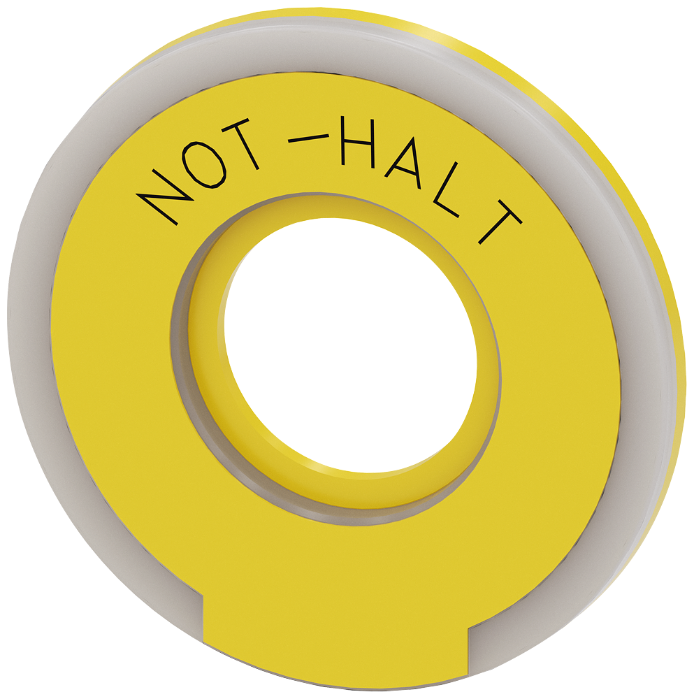 Washer round for EMERGENCY STOP mushroom pushbutton, yellow, illuminated, thickness 5 mm, outer diameter 60 mm, inside diameter 23 mm, with inscription: NOT-HALT