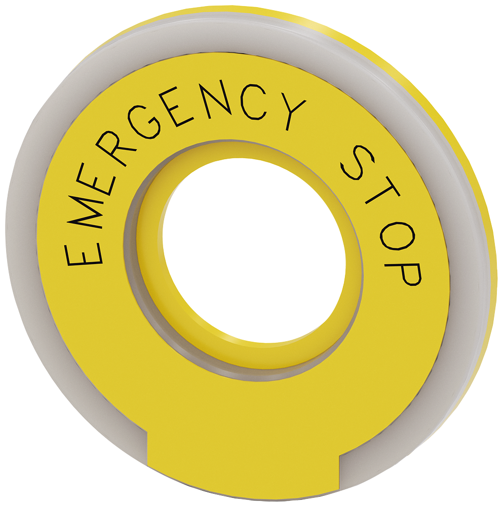 Washer round for EMERGENCY STOP mushroom pushbutton, yellow, illuminated, thickness 5 mm, outer diameter 60 mm, inside diameter 23 mm, with inscription: EMERGENCY STOP