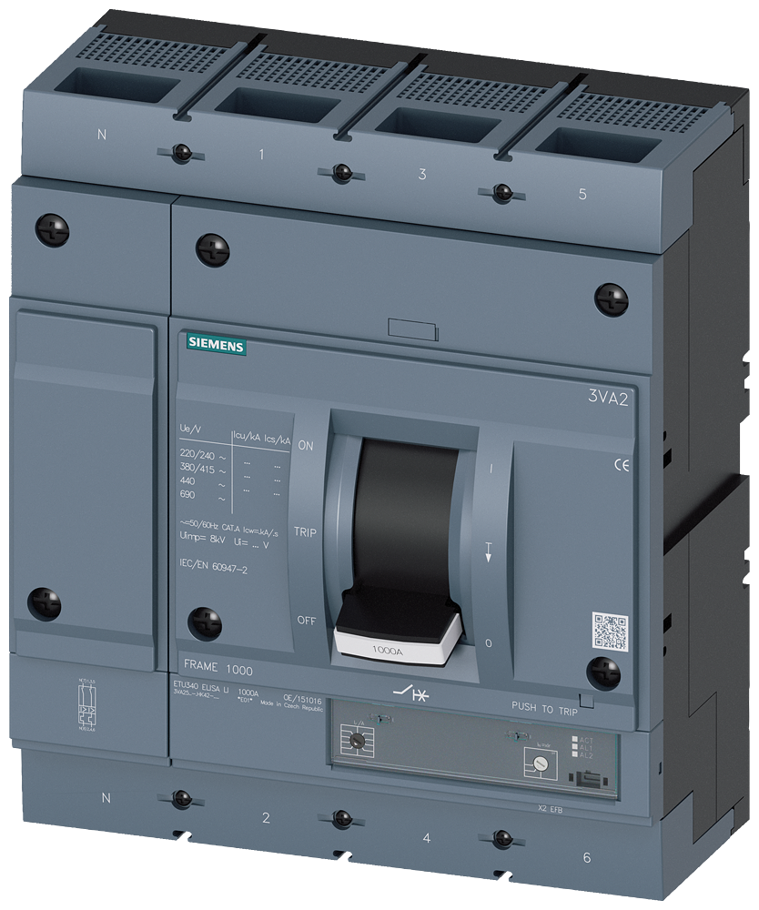 Автоматический выключатель 3VA2 IEC Frame 1000 Switching capacity class H Icu=85 kA @ 415 V 4-pole, system protection ETU340, ELISA LI, In=1000 A Overload protection Ir=400 A...1000 A short-circuit protection Ii=10 x In N-conductor protection adjustable (OFF, 50%, 100%) Lug terminal