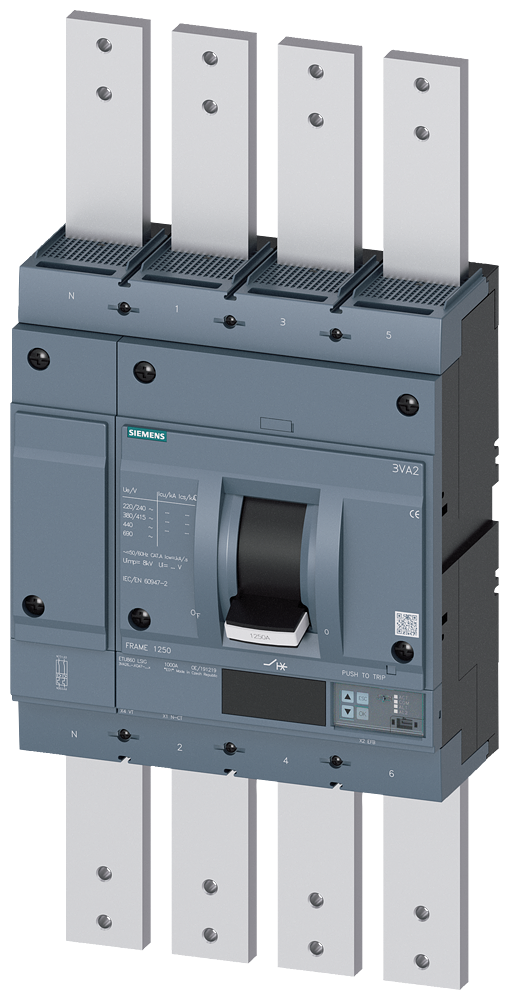 circuit breaker 3VA2 IEC Frame 1250 breaking capacity class H Icu=85 kA @ 415 V 4-pole line protection ETU860 LSIG In=1250 A overload protection Ir=500 A ...1250 A short-circuit protection Isd=06..10x In Ii=15..10x In neutral conductor protection adjustable (OFF up to 100%) ground-fault protection, can be switched off Ig=02... 1 x In tg=005-08s circuit breaker with straight bus connectors extended