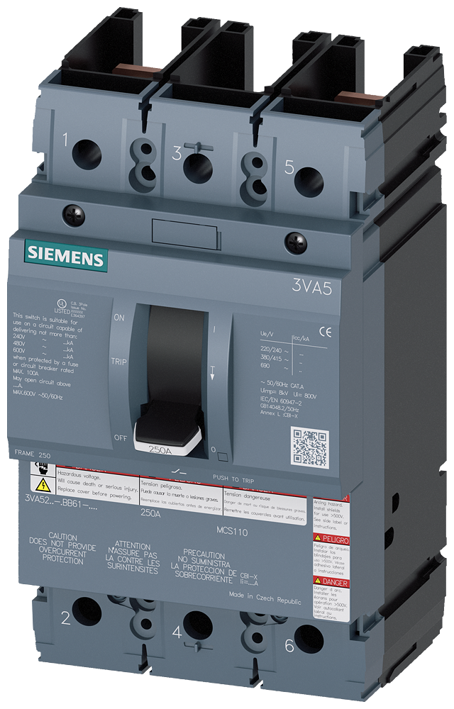 molded case switch 3VA5 UL frame 250 max. sh-circ breaking capacity 100kA @ 480V 2-pole, line protection MCS110, In=100A without overload protection self-protection Ii=16 x In without connection