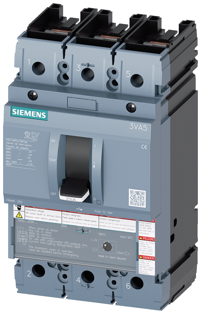circuit breaker 3VA5 UL Frame 250 breaking capacity class C 100 kA @ 480 V 3-pole, line protection TM210, FTFM, In=30 A overload protection Ir=30 A permanently set short-circuit protection Ii=11.67 x In UL 489 SB (naval), 50 °C, cable connection on two sides