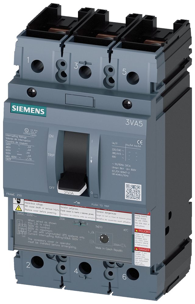 circuit breaker 3VA5 UL Frame 250 breaking capacity class M 35 kA @ 480 V 3-pole, line protection TM210, FTFM, In=20 A overload protection Ir=20 A permanently set short-circuit protection Ii=17.5 x In nut keeper kit on two sides