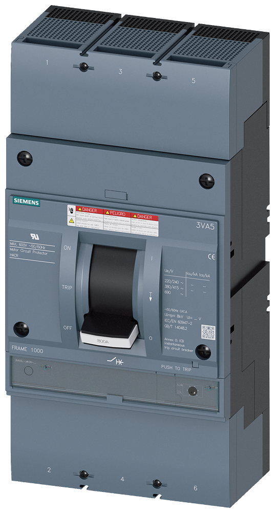 circuit breaker 3VA5 UL frame 800 max short-circuit curr. rating 65 kA @ 480 V w/o contactor 3-pole, mot. starter protection TM120M, AM, In=800A without overload protection short circuit protection Ii=6...12 x In Al-lug, line and load side