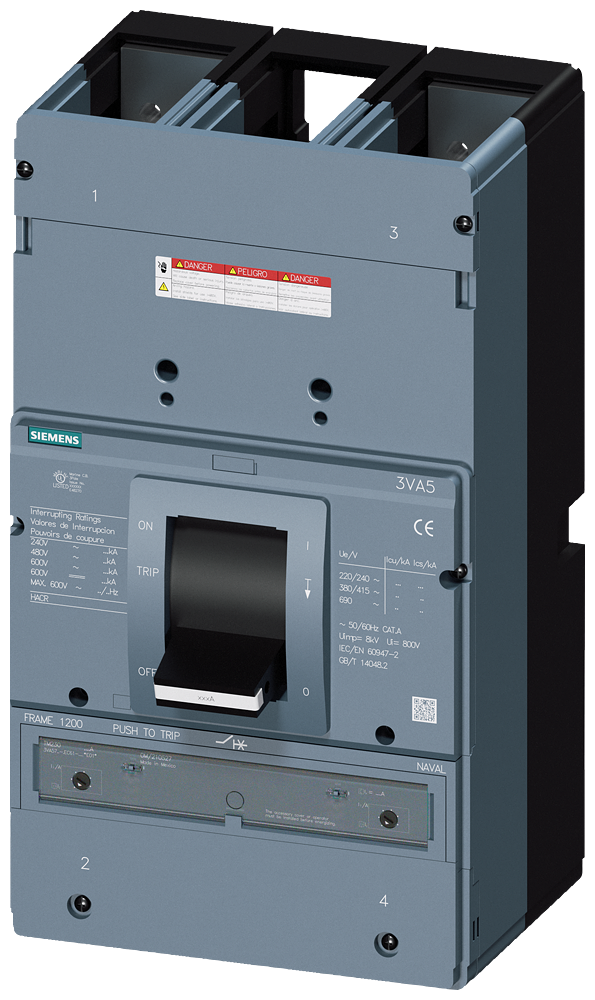 circuit breaker 3VA5 UL frame 1200 breaking capacity class C 100kA @ 480 V 2-pole, line protection TM230, FTAM, In=900A overload protection Ir=900A fixed short circuit protection Ii=5 - 10 x In UL489 SB (NAVAL), 50 deg. CEL. w/o connection