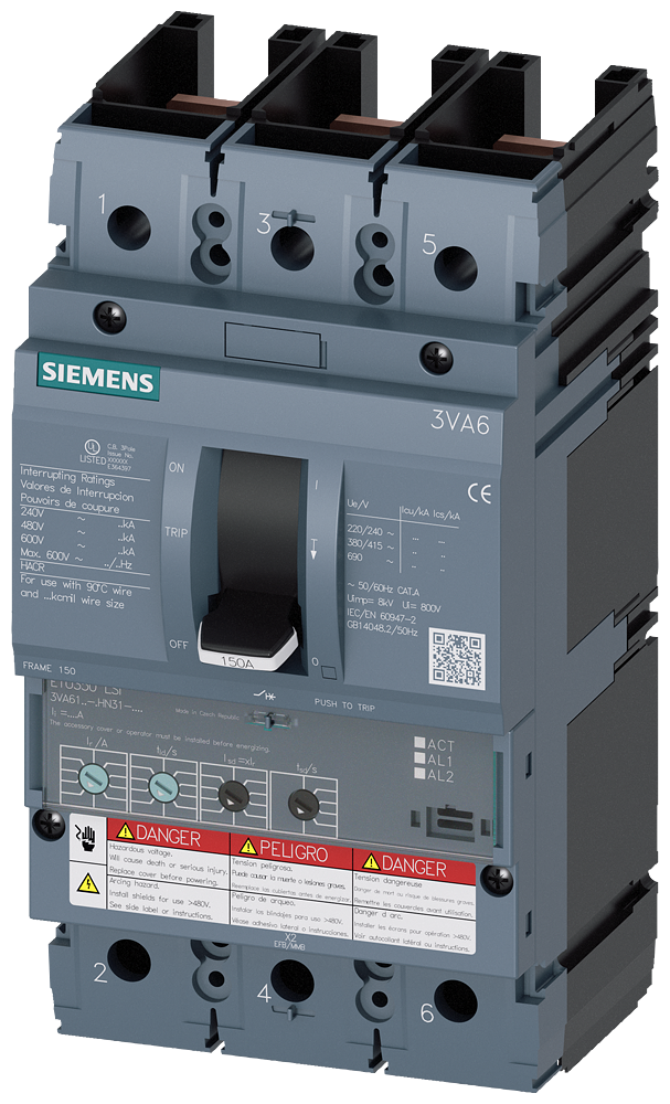Автоматический выключатель 3VA6 UL Frame 150 Switching capacity class M 35kA @ 480V 3-pole, system protection ETU350, LSI, In=100 A Overload protection Ir=40 A...100 A short-circuit protection Isd=1.5...10 x Ir, Ii=12 x In without connection