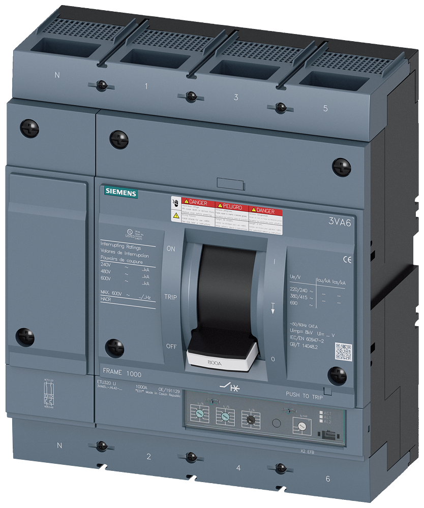 circuit breaker 3VA6 UL Frame 800 breaking capacity class H 65 kA @ 480 V 4-pole, line protection ETU320, LI, In=600 A overload protection, 100% rated Ir=240 A ...600 A short-circuit protection Ii=1.5...12 x In neutral conductor protection adjustable (OFF, 50%, 100%) nut keeper kit