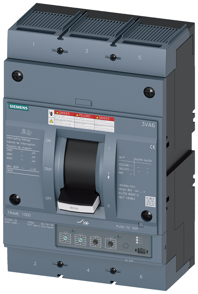 circuit breaker 3VA6 UL Frame 800 breaking capacity class C 100 kA @ 480 V 3-pole, line protection ETU350, LSI, In=600 A overload protection, 100% rated Ir=240 A ...600 A short-circuit protection Isd=1.5... 12 x Ir, Ii=12 x In cable connection on two sides