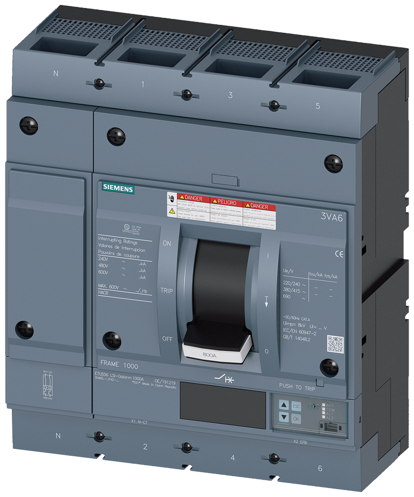 circuit breaker 3VA6 UL Frame 800 breaking capacity class C 100 kA @ 480 V 4-pole, line protection ETU556, LSI, In=600 A overload protection Ir=240 A ...600 A short-circuit protection Isd=0.6..12x In, Ii=1.5..12x In neutral conductor protection adjustable (OFF, up to 130%) ground fault alarm signaled via EFB300 or COM nut keeper kit