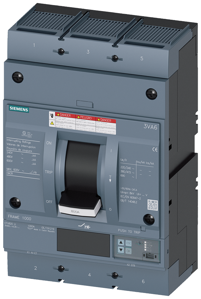 circuit breaker 3VA6 UL Frame 800 breaking capacity class C 100 kA @ 480 V 3-pole, line protection ETU820, LI, In=600 A overload protection, 100% rated Ir=240 A ...600 A short-circuit protection Ii=1.5...10 x In cable connection on two sides