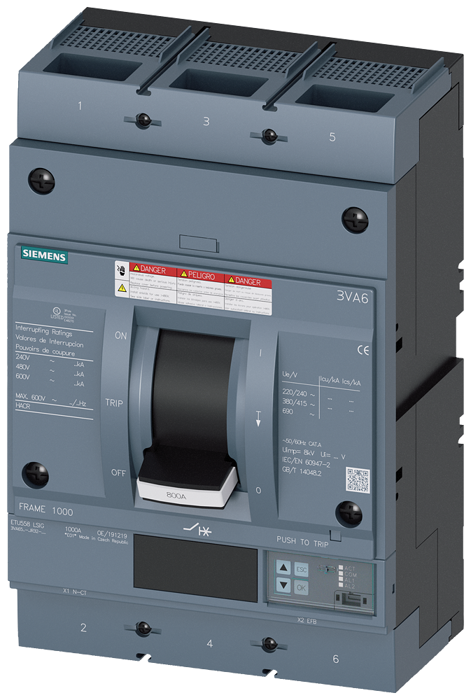 circuit breaker 3VA6 UL Frame 800 breaking capacity class H 65 kA @ 480 V 3-pole, line protection ETU558, LSIG, In=800 A overload protection, 100%-rated Ir=315 A ...800 A short-circuit protection Isd=0.6..10x In, Ii=1.5..10x In neutral conductor protection optionally with ext. CT; up to 160% ground fault protection, can be deactivated Ig=0.2... 1 x In, tg=0.05-0.8s nut keeper kit