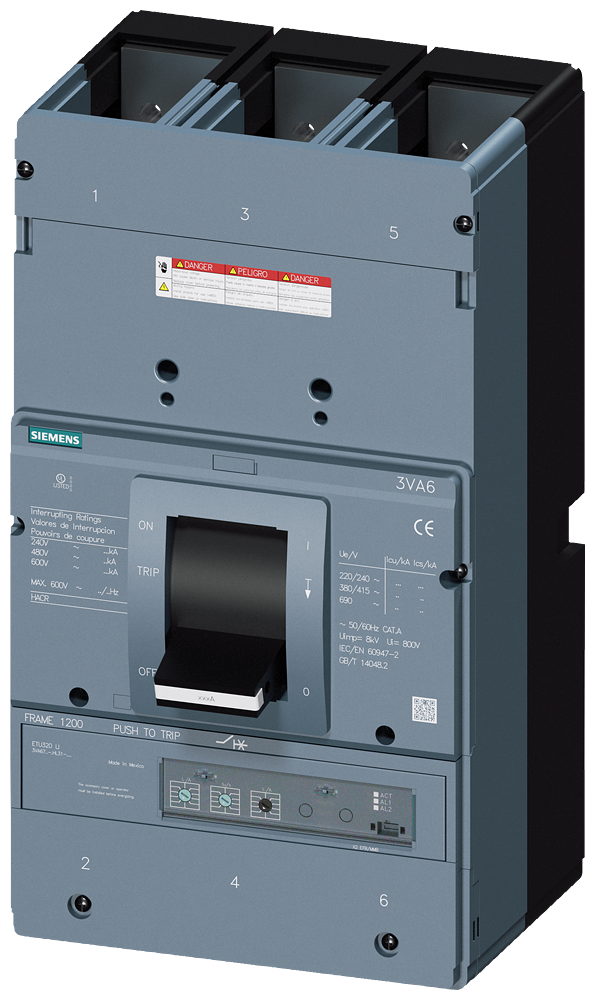circuit breaker 3VA6 UL frame 1200 breaking capacity class M 35kA @ 480 V 3-pole, line protection ETU320, LI, In=1200A overload protection Ir=500A - 1200A short circuit protection Ii=1,5-10 x In w/o connection