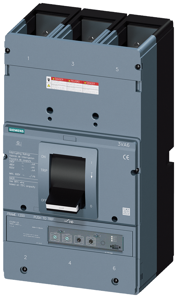 circuit breaker 3VA6 UL frame 1200 breaking capacity class C 100kA @ 480 V 3-pole, line protection ETU350, LSI, In=1200A 100%-rated, overload protection Ir=500A - 1200A short circuit protection Isd=1,5-10 x Ir, Ii=1,5 x In w/o connection
