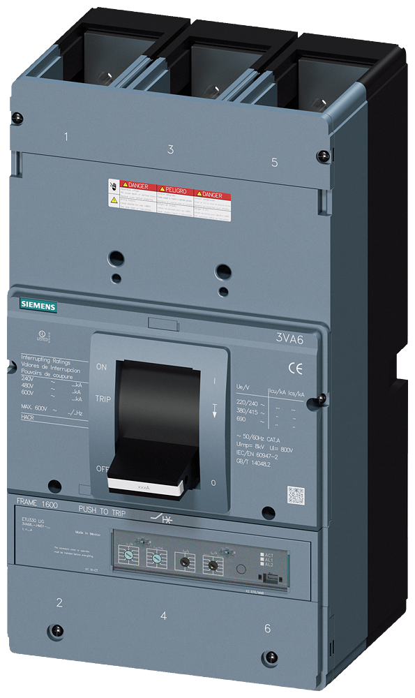 circuit breaker 3VA6 UL frame 1600 breaking capacity class C 100kA @ 480 V 3-pole, line protection ETU330, LIG, In=1600A overload protection Ir=600A - 1600A short circuit protection Ii=1,5-7,5 x In ground fault protection Ig=0,156 - 1 x In, tg=0,1/0,3s w/o connection