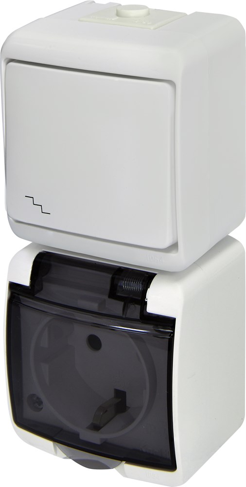 Микс верт.: Лестн.выкл.+ 1-я розетка с з/к VRHP-3sd (белая/прозр. крышка)