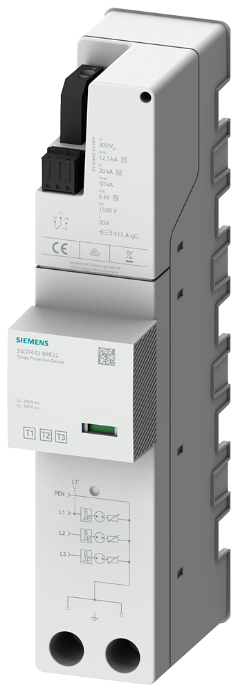 combination arrester type 1+2 requirement class B+C, Uc 300 V, Iimp=12.5 kA 3-pole, 3+0 circuit for TNC systems, for 40 mm busbar system with remote display and phase tap