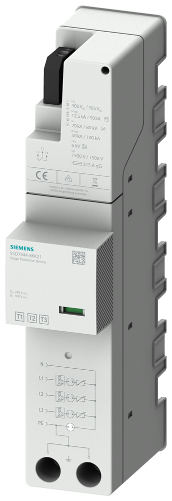 combination arrester type 1+2 requirement class B+C, Uc 300 V, Iimp=12.5 kA 4-pole, 3+1 circuit for TN-S and TT systems, for 40 mm busbar system with remote display