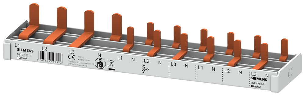 compact Pin Busbar, 10mm2 connection: 3p/N (RCCB N-right) 1x RCCB 4-pole + 6x compact device 1MW touch protected 10 MW cuttable