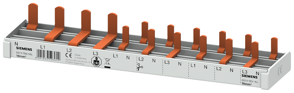 compact Pin Busbar, 10mm2 connection: 3p/N (RCCB N-left) 1x RCCB 4-pole + 6x compact device 1MW touch protected 10 MW cuttable