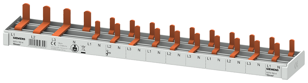 compact Pin Busbar, 10mm2 connection: 3p/N (RCCB N-right) 1x RCCB 4-pole + 10x compact device 1MW touch protected 14 MW cuttable