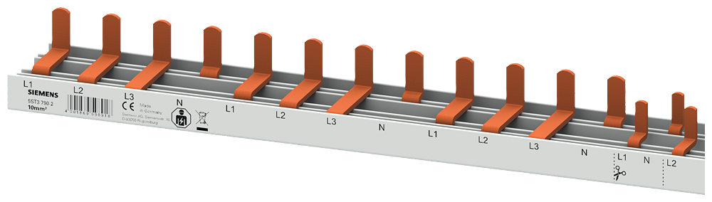 compact Pin Busbar, 10mm2 connection: 3p/N (RCCB N-right) 1x RCCB 4-pole+2x MCB 4-pole+ 45x compact device 1MW touch protected 57 MW (1m) cuttable