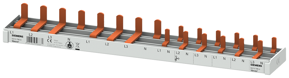 compact Pin Busbar, 10mm2 connection: 3p/N (RCCB N-right) 1x RCCB 4-pole+1x MCB 4-pole+ 6x compact device 1MW touch protected 14 MW cuttable