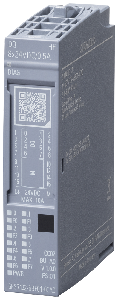 SIPLUS ET 200SP DQ 8x24 V DC/0.5 A HF based on 6ES7132-6BF01-0CA0 with conformal coating -40...+70 °C output module, DQ 8x24 V DC/0.5 A High Feature, source output (PNP,sourcing output) packing unit: 1 unit, suitable for BU type A0, color code CC02, channel diagnostics for: short-circuit and wire break, supply voltage, channel fault