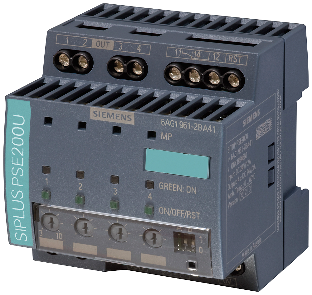 SIPLUS PS, модуль селективности PSE200U 10A, со стойким покрытием, на основе 6EP1961-2BA41 . 4х-канальный модуль селективности, вход: =24 В, выход: =24 В/10 A на канал, выходной ток настраивается в диапазоне 3-10 А, с диагностикой индивидуального состояния каналов