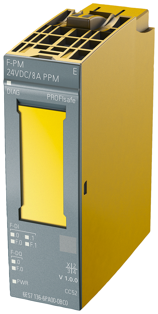 SIPLUS ET 200SP, модуль питания F-PM-E 24VDC/8A PPM RAIL для применения на ж/д, рабочая температура -25 ... +60°C, до +70°C в течение 10 минут, со стойким покрытием, на основе 6ES7136-6PA00-0BC0 . модуль питания F-PM-E, PPM PROFISAFE, =24 В, отказобезопасное включение выходов DQ и F-DQ, для отказобезопасных систем вплоть до PL D / SIL2 или PL E / SIL3, 2 отказобезопасных дискретных входа, 1 отказобезопасный дискретный выход