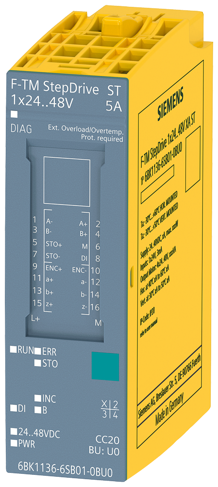 SIMATIC F-TM StepDrive ST, drive controller for stepper motors in the safety extra low voltage range, 24 to 48 V DC power supply of the drive, output current 5 A, for SIMATIC ET 200SP, STO hardwired