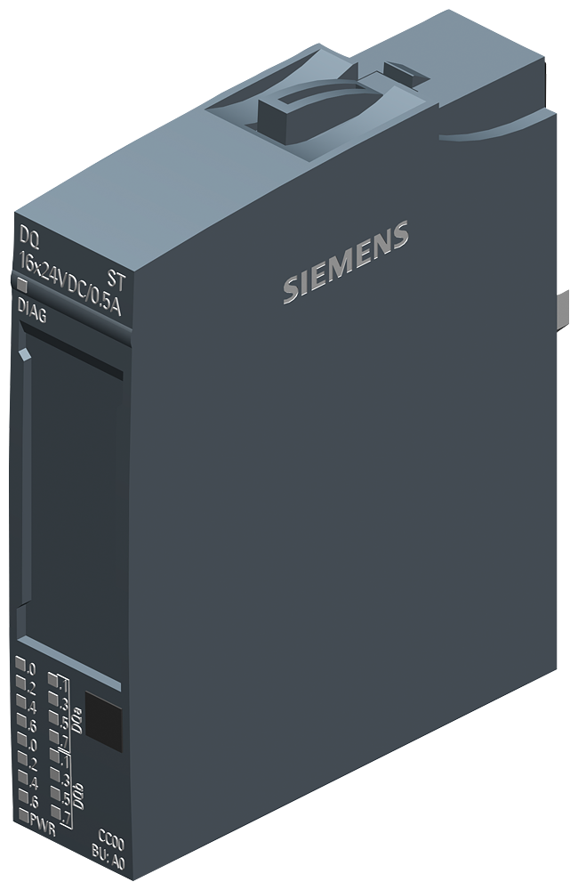 SIMATIC ET 200SP, модуль дискретных выходов, DQ 16x 24V DC/0,5A ST, со стандартными функциями, выход PNP, (source, P-switching), упаковка из 10 шт., для установки на базовый блок типа A0, цветовой код CC00, замещающее значение, диагностика модуля для: КЗ на L+ и на землю, обрыв проводов