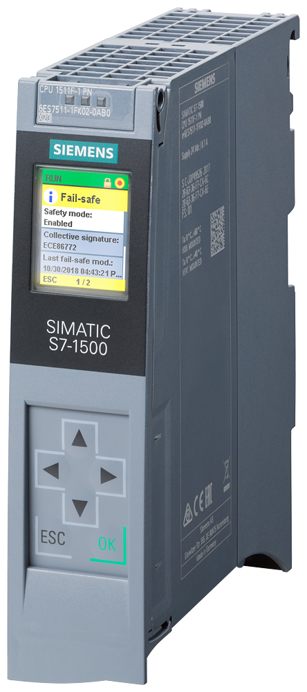 SIMATIC S7-1500F, центральный процессор CPU 1511F-1 PN для стандартных и отказобезопасных задач, рабочая память 225 кБ для программы и 1 МБ для данных, 1 интерфейс - PROFINET IRT С 2х-портовым коммутатором, производительность 60 нс на битовую операцию, необходима карта памяти SIMATIC MC