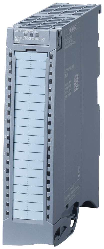SIMATIC S7-1500, модуль аналоговых входов, AI 8xU/I/R/RTD BA, разрешение 16 бит, точность 0.5%, 8 каналов в группе из 8, напряжение общей точки =4 В, диагностика, прерывания процесса, включая вводной элемент, зажим и клемму заземления, фронтальный соединитель должен быть заказан отдельно