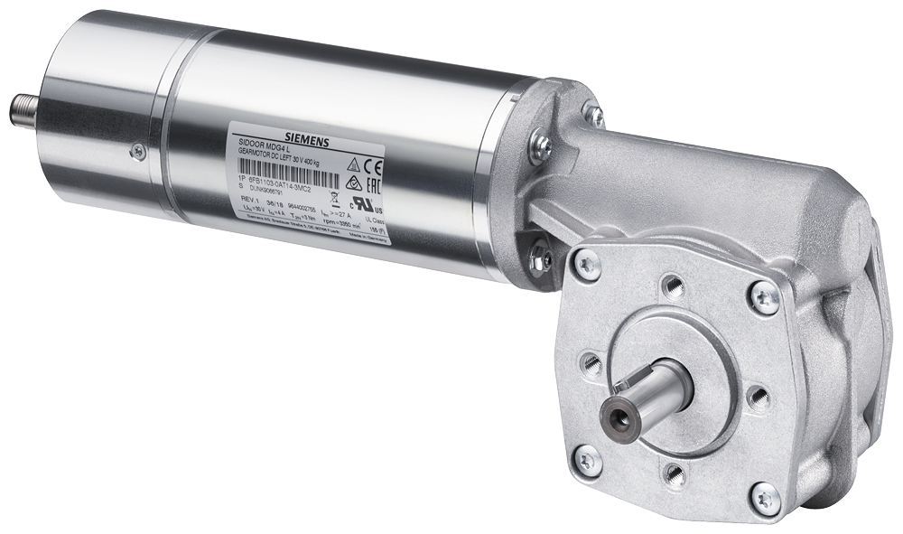 SIDOOR, мотор-редуктор MDG4 L, вал отбора мощности редуктора слева, с пазом и шпонкой A5x5 исполнение согласно DIN 6885, макс. Подвижная масса 400 кг, IP56, 2x M12 для раздельного подключения кабеля мотора, =30 В, -20 ... +50 °C