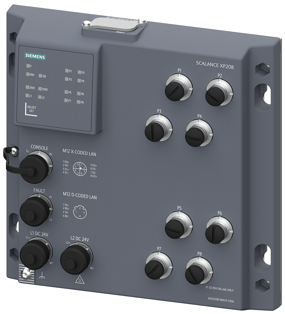 SCALANCE XP208, IP65, layer 2 IE switch, 6x 100 Mbps, 2x 1000 Mbps, LED diagnostics, error signaling contact, redundant power supply, IEC 62443-4-2 certified PROFINET IO device, network management, can be operated in redundant ring, dust caps, including -40 °C to +70 °C, C-PLUG optional.